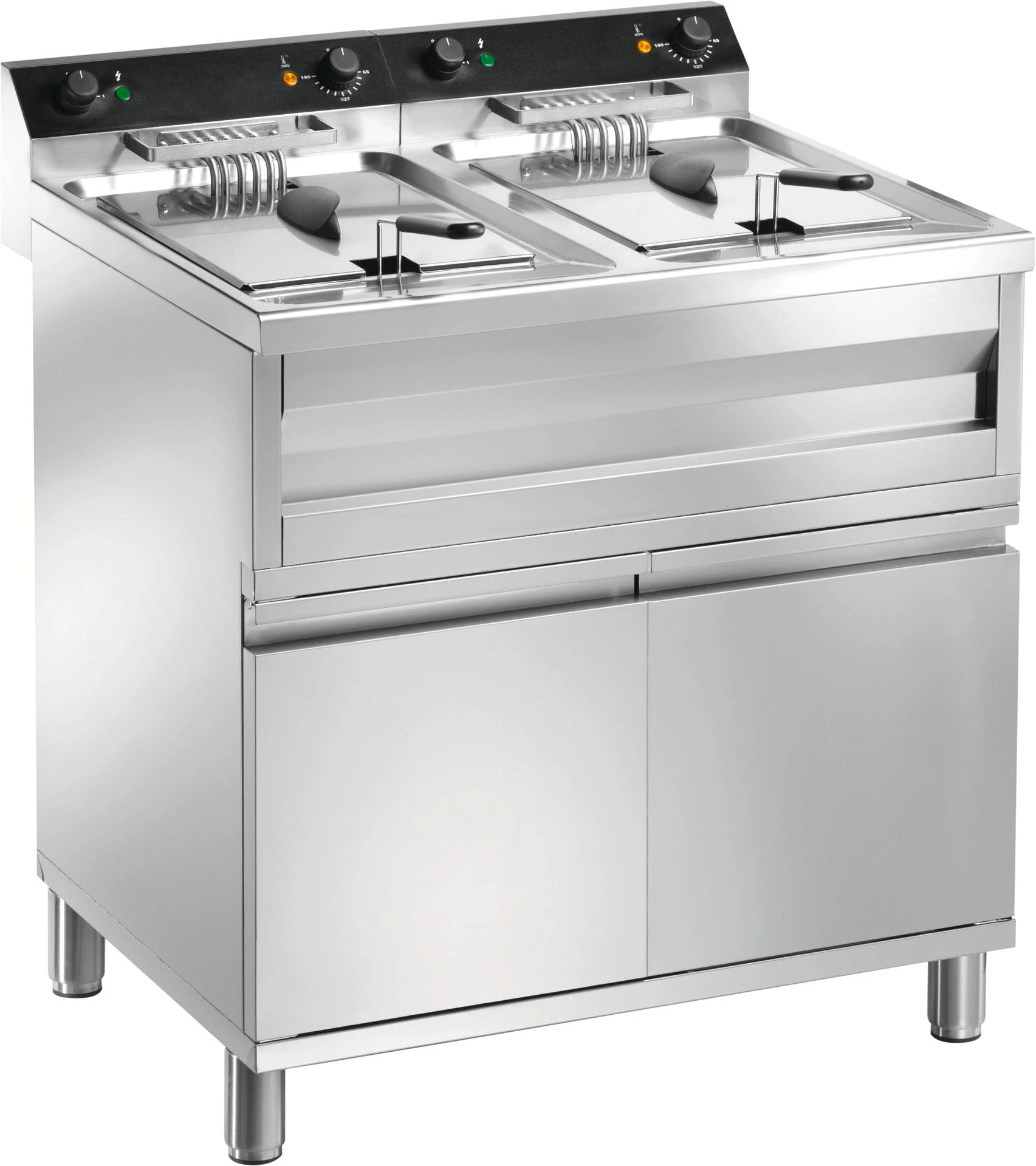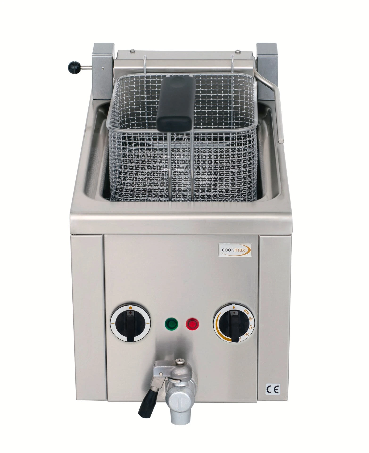 > Gehäuse aus Edelstahl > Temperaturbereich: 50°C bis 180°C > Sicherheitsthermostat > Mikroschalter > kalte Zone > abnehmbare Heizelemente > ausgestattet mit Leistungsschützen > mit Ablasshahn > inklusive 2 Körbe 210 x 280 x 120 mm