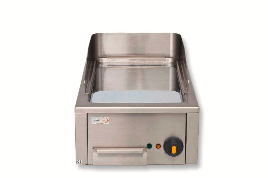 > Edelstahlkorpus > mit Fettauffangschublade > Bratfläche aus verchromtem 10 mm Stahl, 320 x 480 mm > geschützt vor thermischen Schwankungen > Aufkantung an 3 Seiten > Temperaturbereich: 50°C bis 300°C